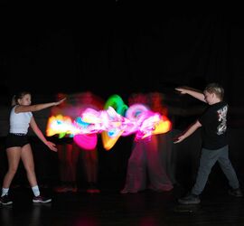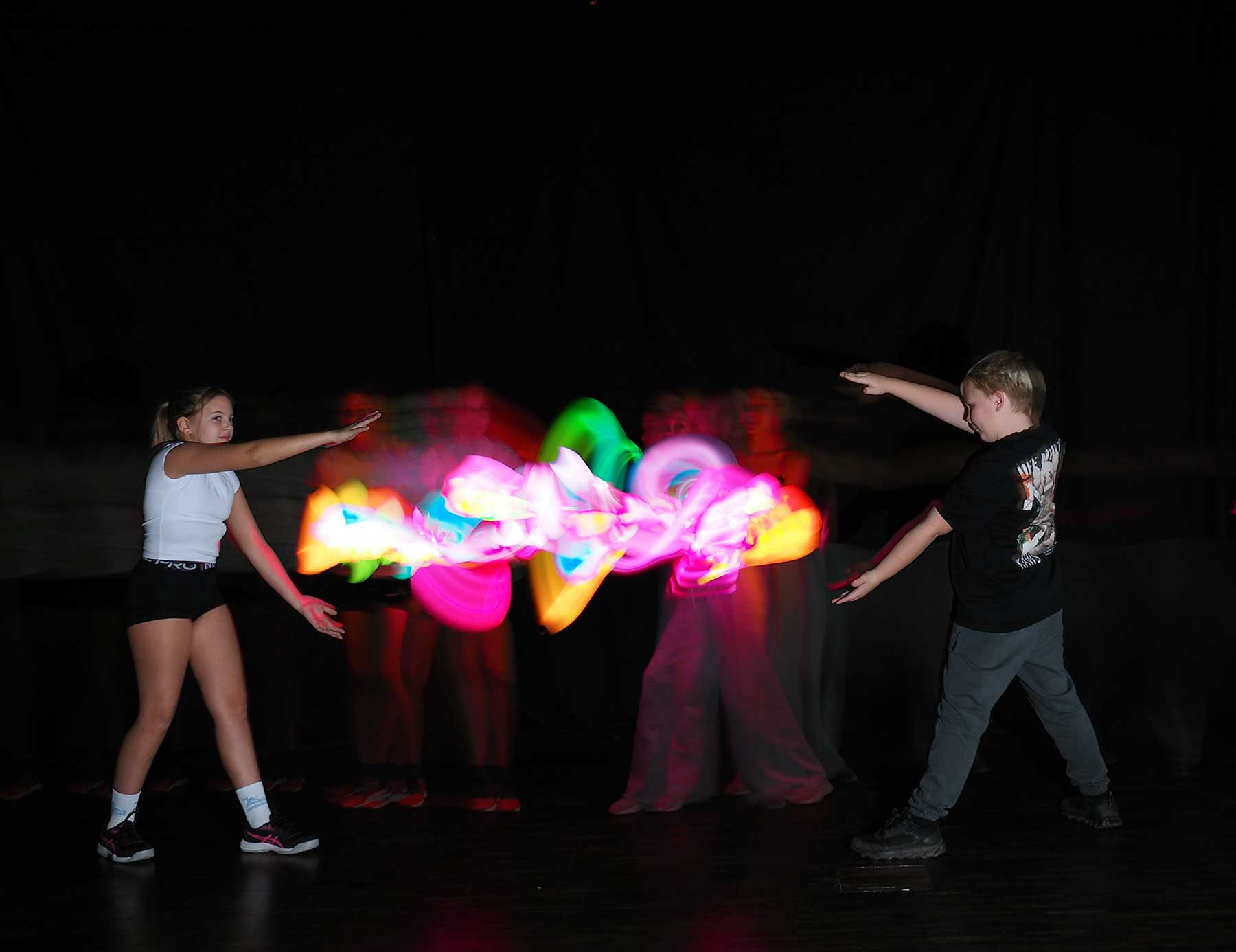 Am zweiten Tag wurde es besonders spektakulär: Mit LED-Jongliergeräten und Langzeitfotografie entstanden beeindruckende Lichtmalereien. Die Kinder erforschten, wie Bewegungen mit Licht sichtbar werden, entwickelten kleine Choreografien und hielten diese künstlerisch fest. Das Finale war eine kleine Präsentation der neuen Erlebnisse für die Familien und Freunde der jungen Lichtkünstler.